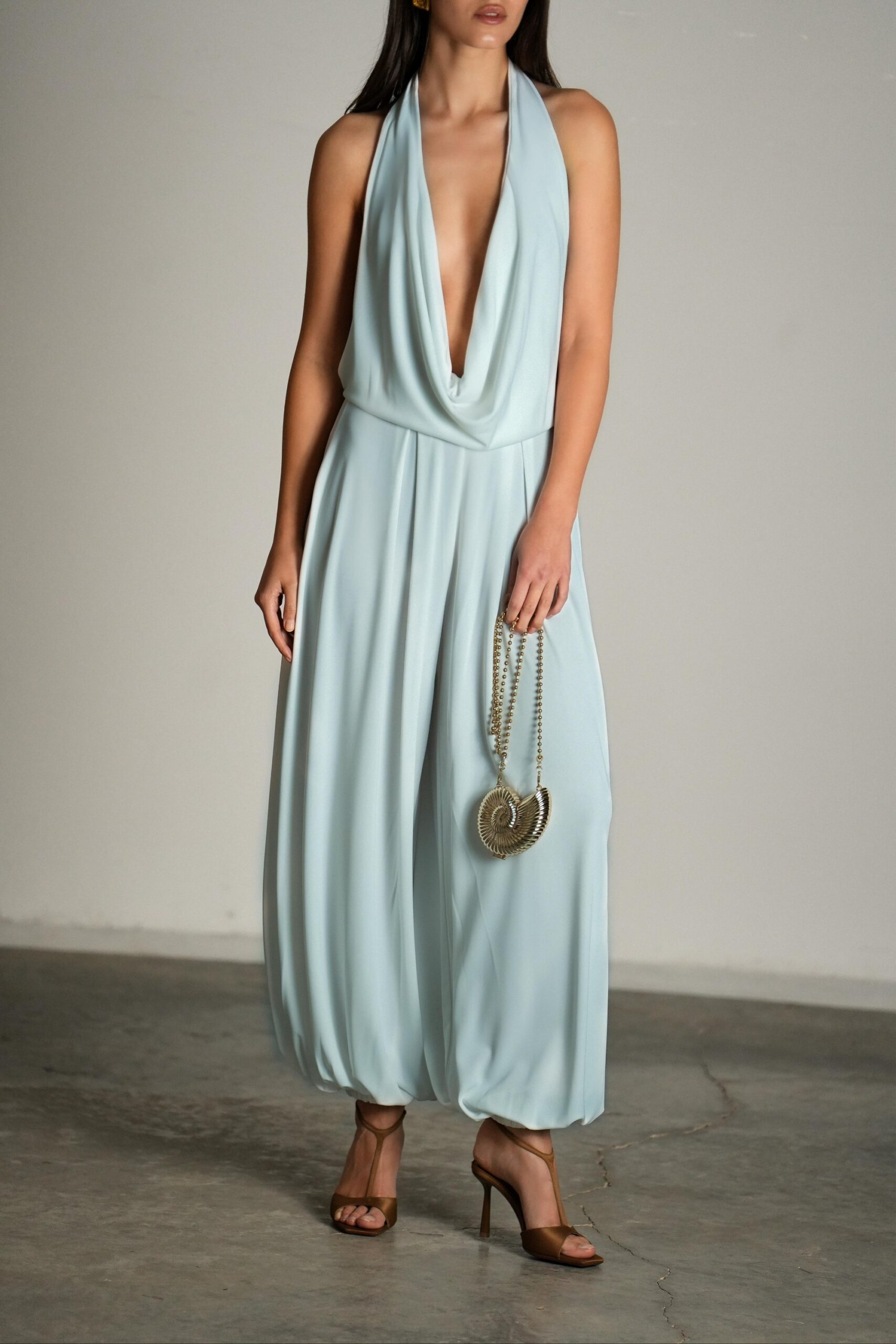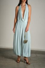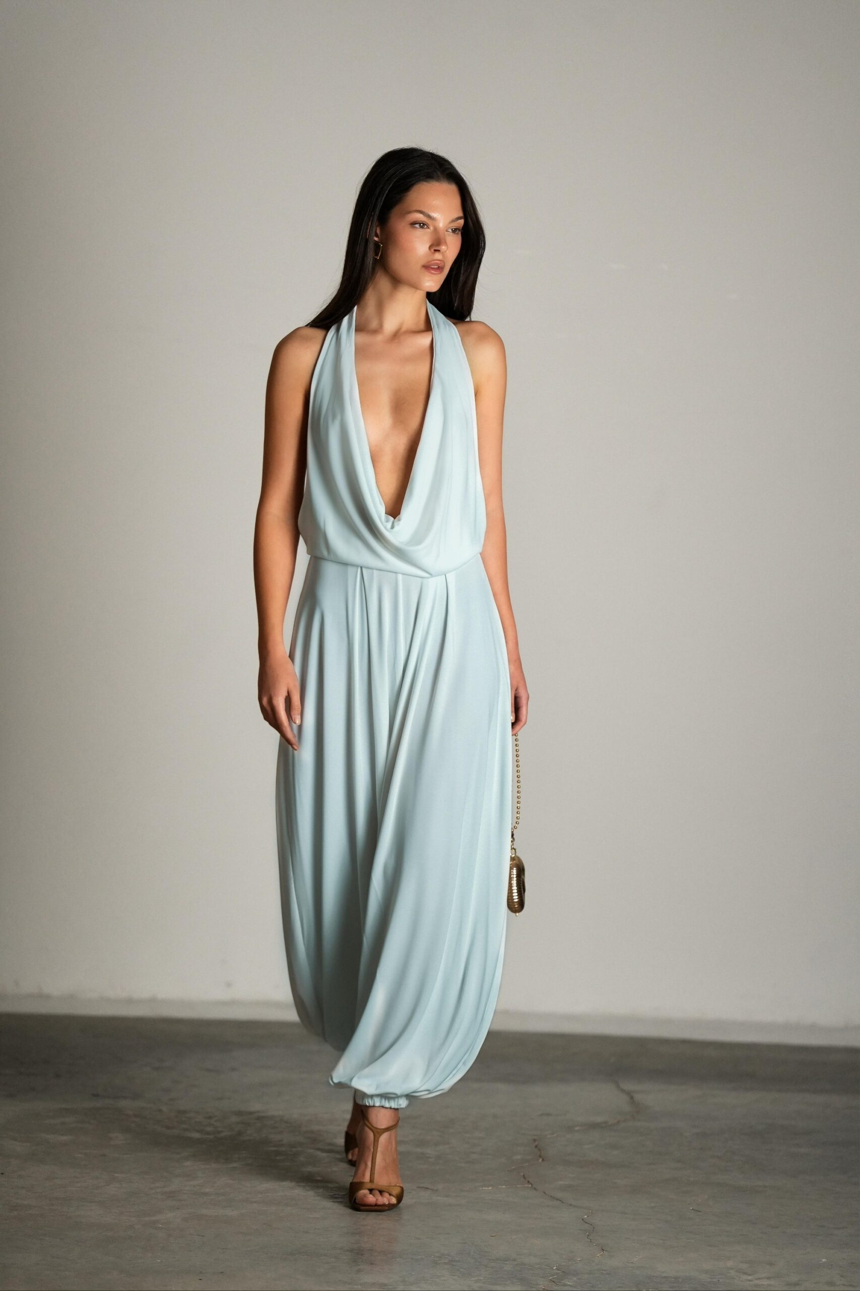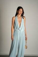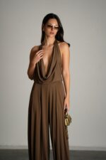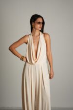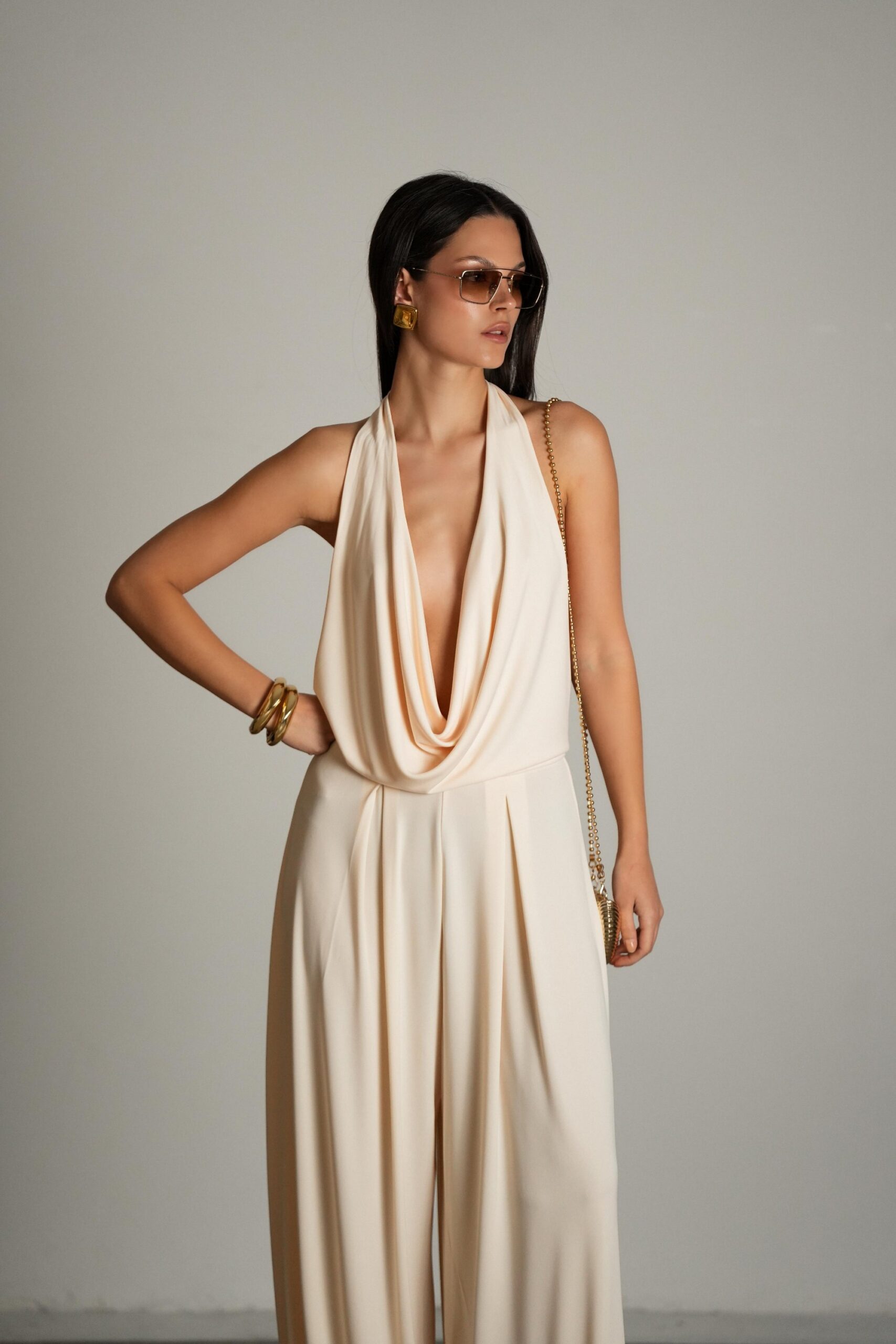 אוברול ערב אלגנטי לנשים, המעוצב מבד רך, נשפך ונעים למגע המעניק תחושת קלילות וריחופיות. האוברול מציג חלק עליון בגזרת קולר קשירה עם מחשוף עמוק ונשפך, היוצר מראה רומנטי, מתוחכם וסקסי. המותן מודגשת בעדינות וממנה נשפכים מכנסיים רחבים וזורמים המסתיימים בכיווץ בקרסול, מה שיוצר צללית עדכנית של מכנסי בלון טרנדיים. אידיאלי כאוברול לאירוע, לוק לחופשת ריזורט, חתונת צהריים או ערב קוקטייל בלתי נשכח שבו את רוצה לבלוט בסטייל קוטור.