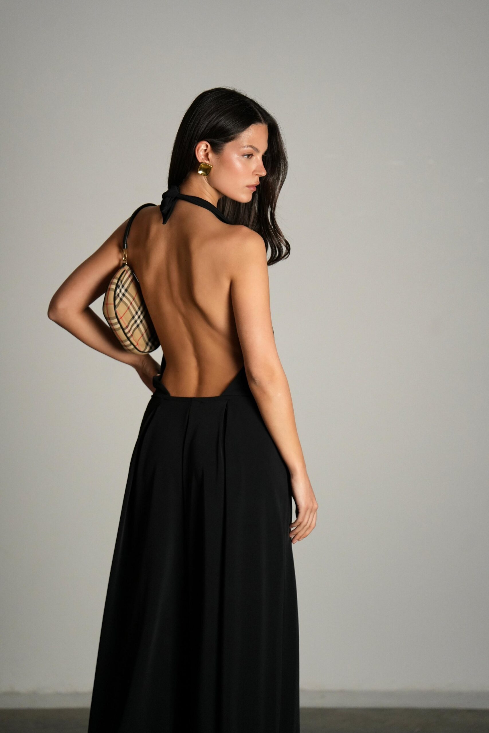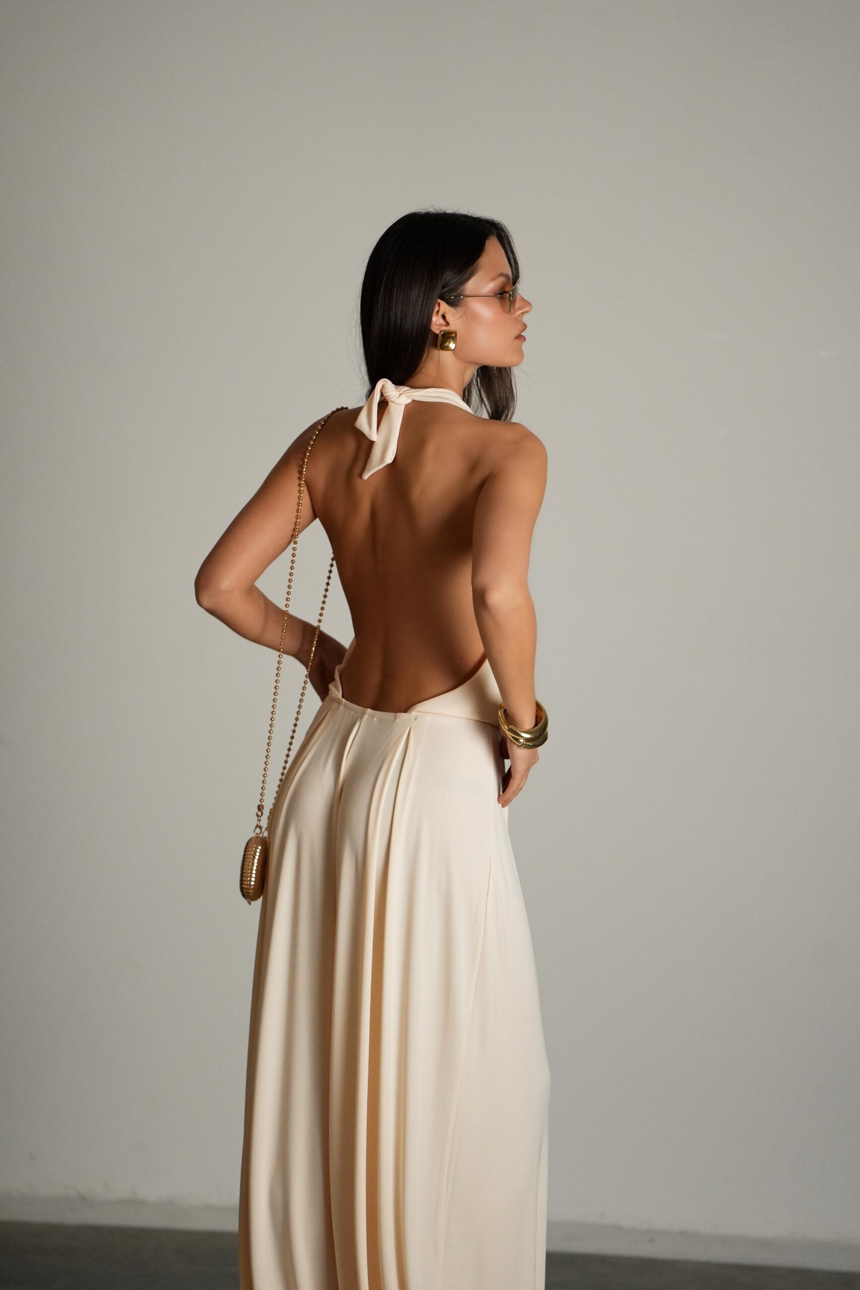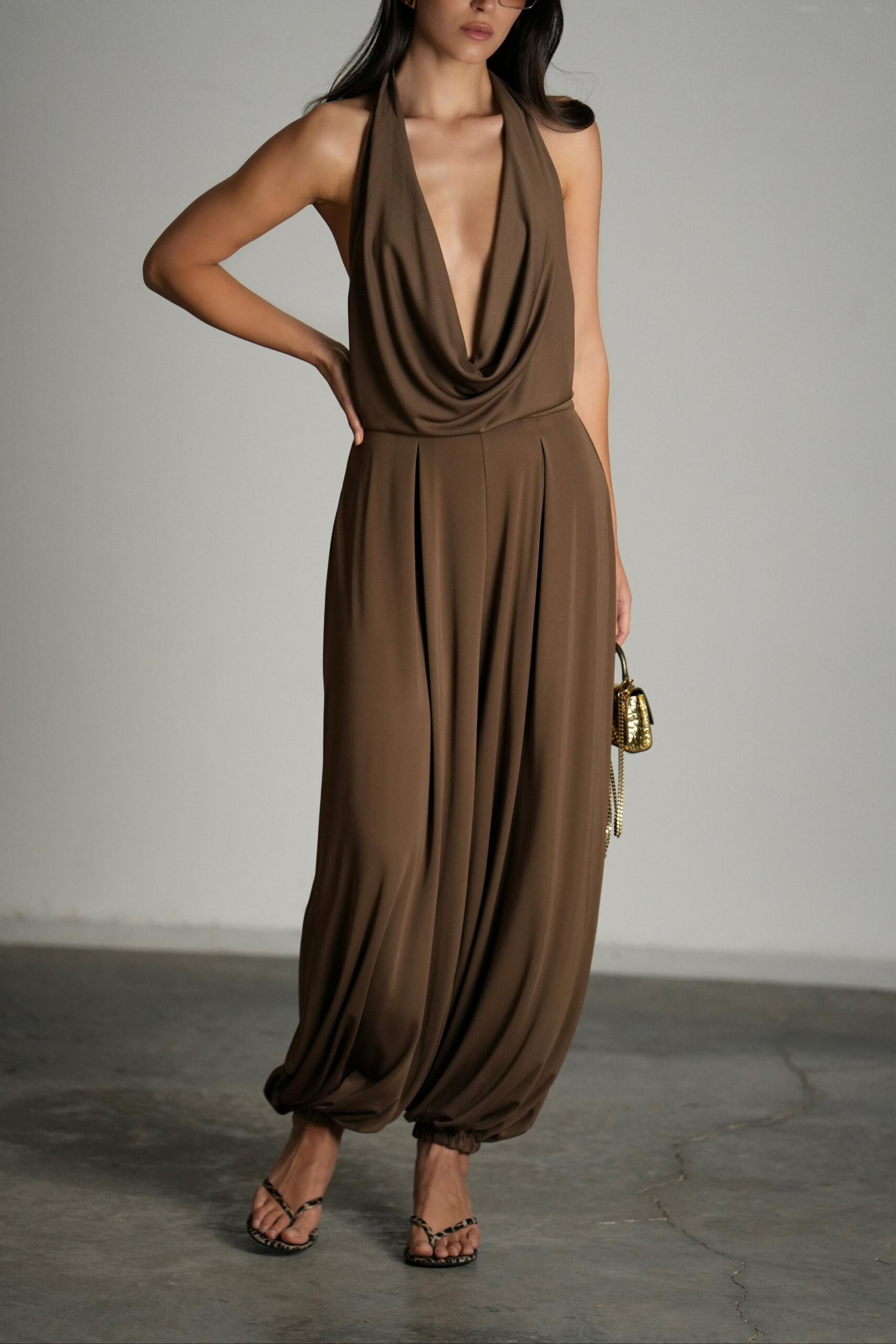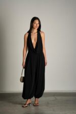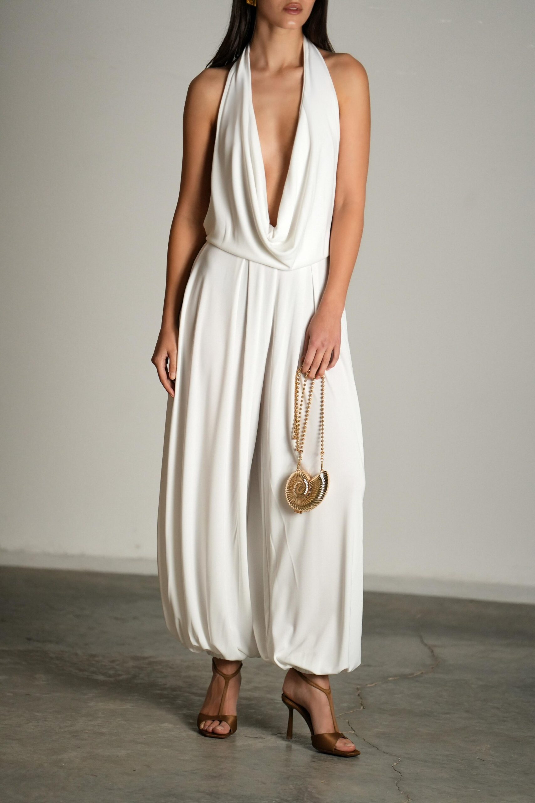 אוברול ערב אלגנטי לנשים, המעוצב מבד רך, נשפך ונעים למגע המעניק תחושת קלילות וריחופיות. האוברול מציג חלק עליון בגזרת קולר קשירה עם מחשוף עמוק ונשפך, היוצר מראה רומנטי, מתוחכם וסקסי. המותן מודגשת בעדינות וממנה נשפכים מכנסיים רחבים וזורמים המסתיימים בכיווץ בקרסול, מה שיוצר צללית עדכנית של מכנסי בלון טרנדיים. אידיאלי כאוברול לאירוע, לוק לחופשת ריזורט, חתונת צהריים או ערב קוקטייל בלתי נשכח שבו את רוצה לבלוט בסטייל קוטור.
