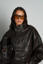 ז'קט דמוי עור איכותי במיוחד, עמיד ונושם, בגוון חום שוקולד עמוק המעניק מראה עשיר ומתוחכם. הז'קט מעוצבת בגזרת ביקר'ס (Biker) קלאסית הכוללת צווארון רחב עם כפתורי תיק-תק, רוכסן מתכתי אלכסוני בחזית, שני כיסי רוכסן צידיים ורוכסנים בסיומת השרוולים המאפשרים התאמה אישית של הגזרה. התפרים האורכיים והרוחביים המדויקים מפסלים ומחמיאים לצללית הגוף.