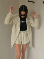 שיק אירופאי שאי אפשר להתעלם ממנו. חליפת שני חלקים בגוון לבן, עשויה בד רך, קליל ונשפך המעניק תנועה מהפנטת. הסט משלב עליונית ורסטילית עם פתיחה קדמית נוחה וחגורת קשירה להדגשת הצללית, ומכנסיים קצרים בגזרה גבוהה עם כפלים עמוקים המעניקים צללית מחמיאה ומראה של חצאית זורמת ומלאת שיק. הטוטאל-לוק המדויק לערב קיץ, לחגיגת בוקר או לחופשה בסטייל יוקרתי ונינוח.