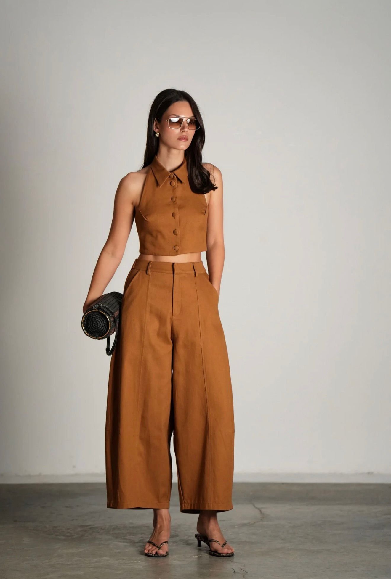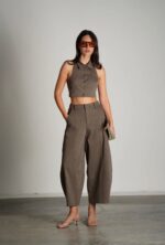 מחפשת את חליפת השני חלקים שתשלב חייטות מוקפדת עם הטרנדים הכי חמים של העונה? הכירי את סט טוסקנה. מדובר בחליפת נשים מעוצבת וייחודית בגוון אלגנטי. החלק העליון הוא חולצת קרופ (חולצת בטן) ללא שרוולים, המעוצבת בסגנון מחויט עם מחשוף קולר, צווארון קלאסי ורכיסת כפתורים קדמית לכל אורכה. החלק התחתון מורכב ממכנסי בלון רחבים ומחויטים, הכוללים גזרה גבוהה האוספת את המותן, ותפרי אורך קדמיים בולטים המעניקים אשליית אורך ומייצרים מבנה אדריכלי ומתוחכם למכנס. השילוב יוצר מראה נשי, אלגנטי ועדכני. אידיאלית כחליפה לאירועי יום, בגדי ריזורט, או הופעה מנצחת לפגישות ולבילויים.