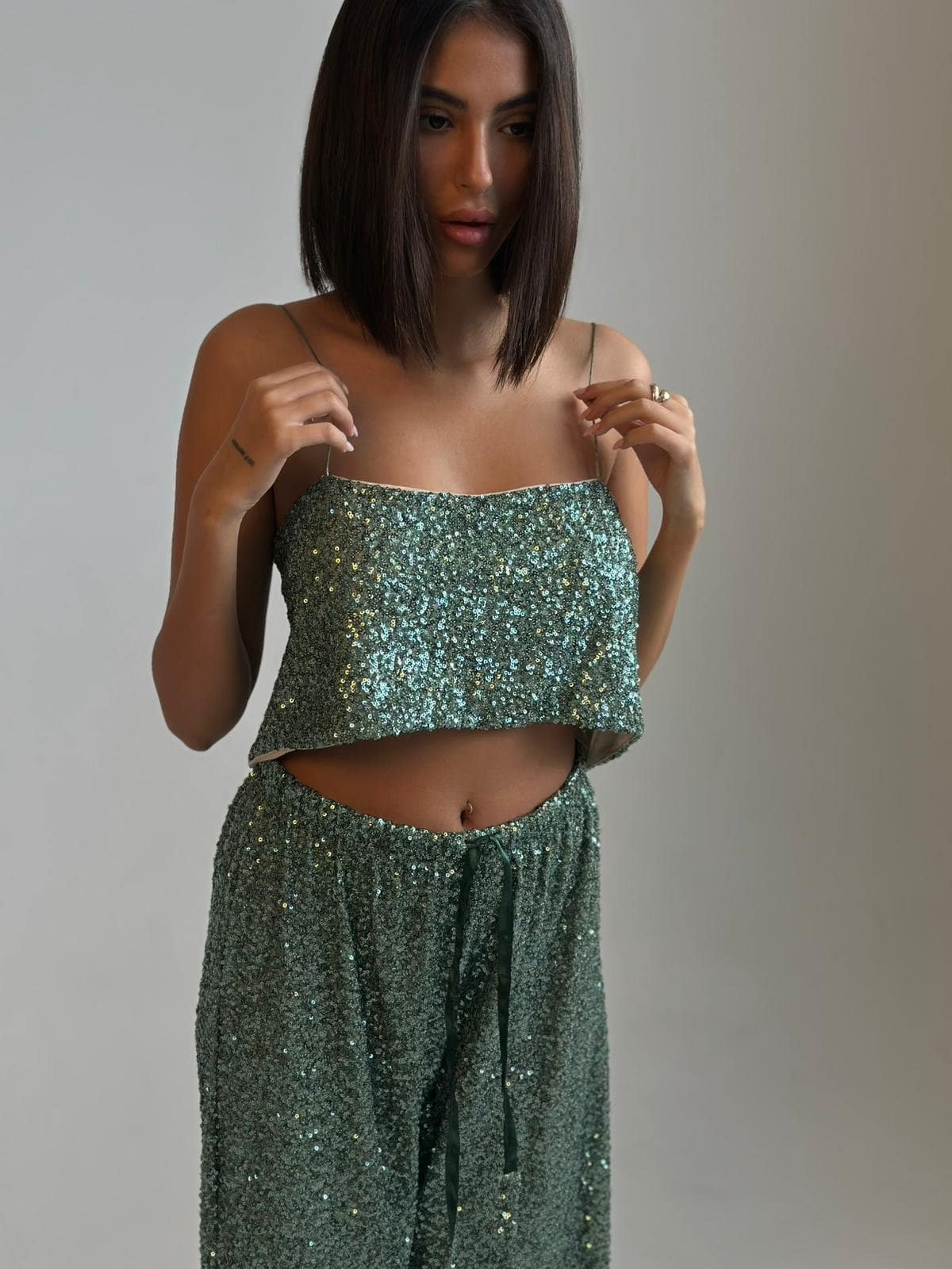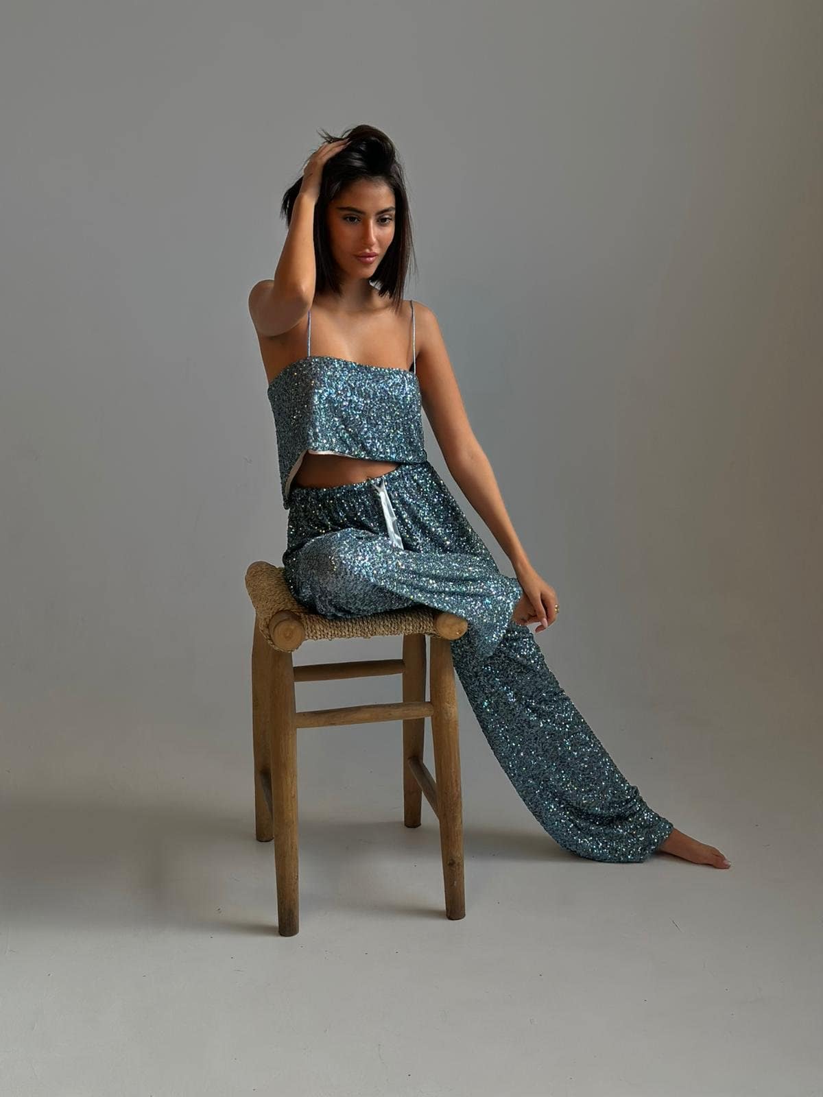 תתכונני לנצוץ. טופ קרופ עדין עם כתפיות דקיקות ומכנסיים רחבים ונינוחים. לוק עוצמתי, חגיגי ומלא בסטייל שייקח אותך לרחבת הריקודים, למסיבה או לכל אירוע שבו את רוצה להיות מרכז העניינים. חלק מסט.