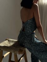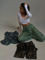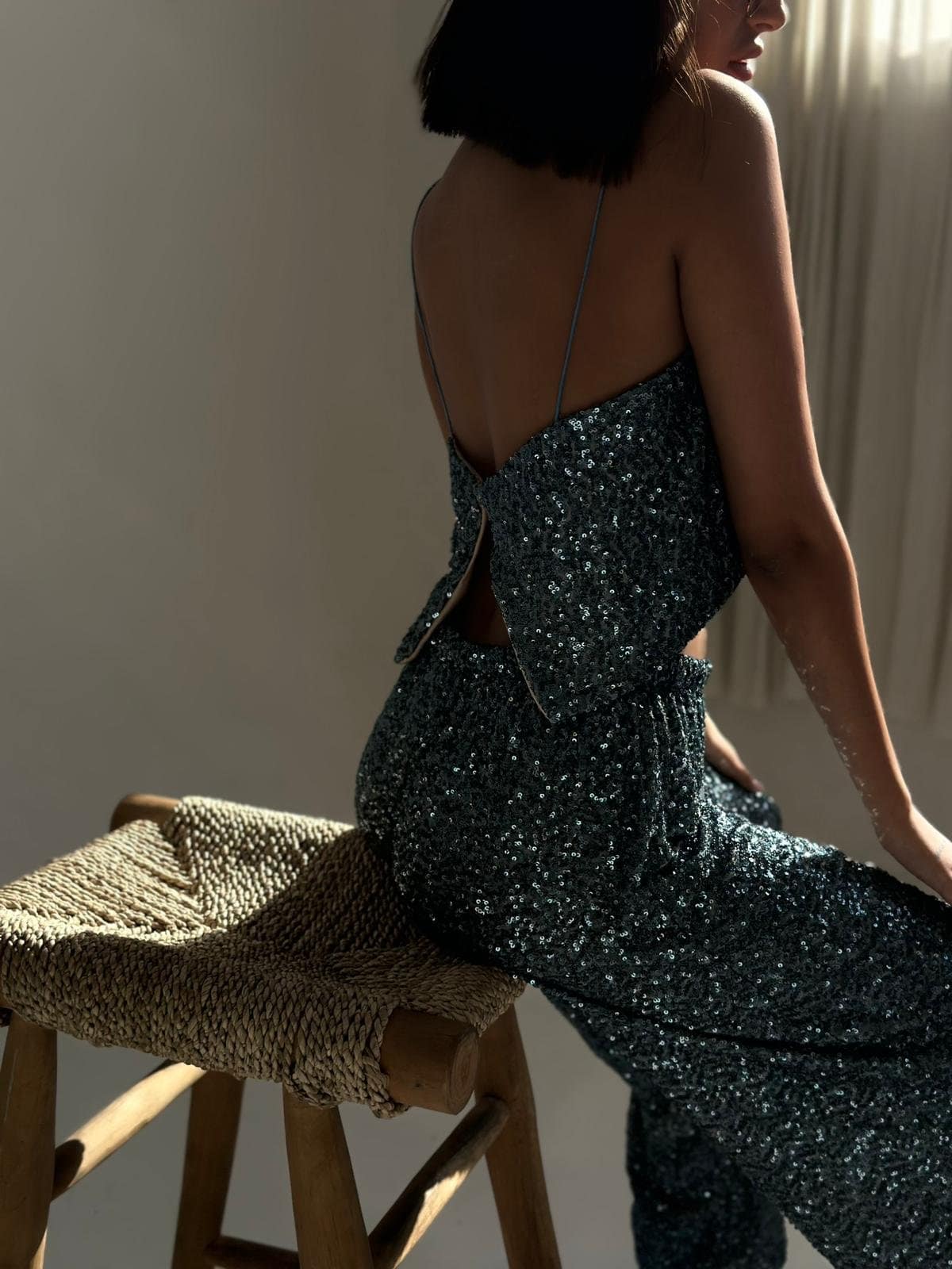 מחפשת את חליפת המסיבה האולטימטיבית? טופ GLIMMER הוא הפריט המדויק שחיפשת בקולקציית אופנת הנשים של הבוטיק. טופ קרופ (Crop Top) עם מחשוף גב ייחודי וכתפיות ספגטי דקיקות, ומכנסיים רחבים בגזרה גבוהה עם שרוך להידוק במותן.