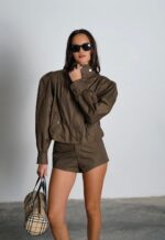 חליפת שני חלקים לנשים המעוצבת בטקסטורה עשירה בצבע חום. הסט כולל ז'קט-בלייזר מחויט בגזרה נינוחה עם רכיסת כפתור מרכזית, המאופיין בשרוולים ארוכים ומתרחבים בגזרת פעמון דרמטית המעניקה צללית ייחודית ומלאת תנועה. החלק התחתון מורכב ממכנסי שורטס קצרים ותואמים בגזרה מובנת ומחמיאה, הכוללת כיסים צדדיים ורכיסת רוכסן וכפתור מרכזית למראה מוקפד המדגיש את המותן ומאריך את הרגליים. אידיאלי כלוק ליציאה, אירוע ערב, פגישה עסקית קלילה או בילוי אדג'י עם חברות.