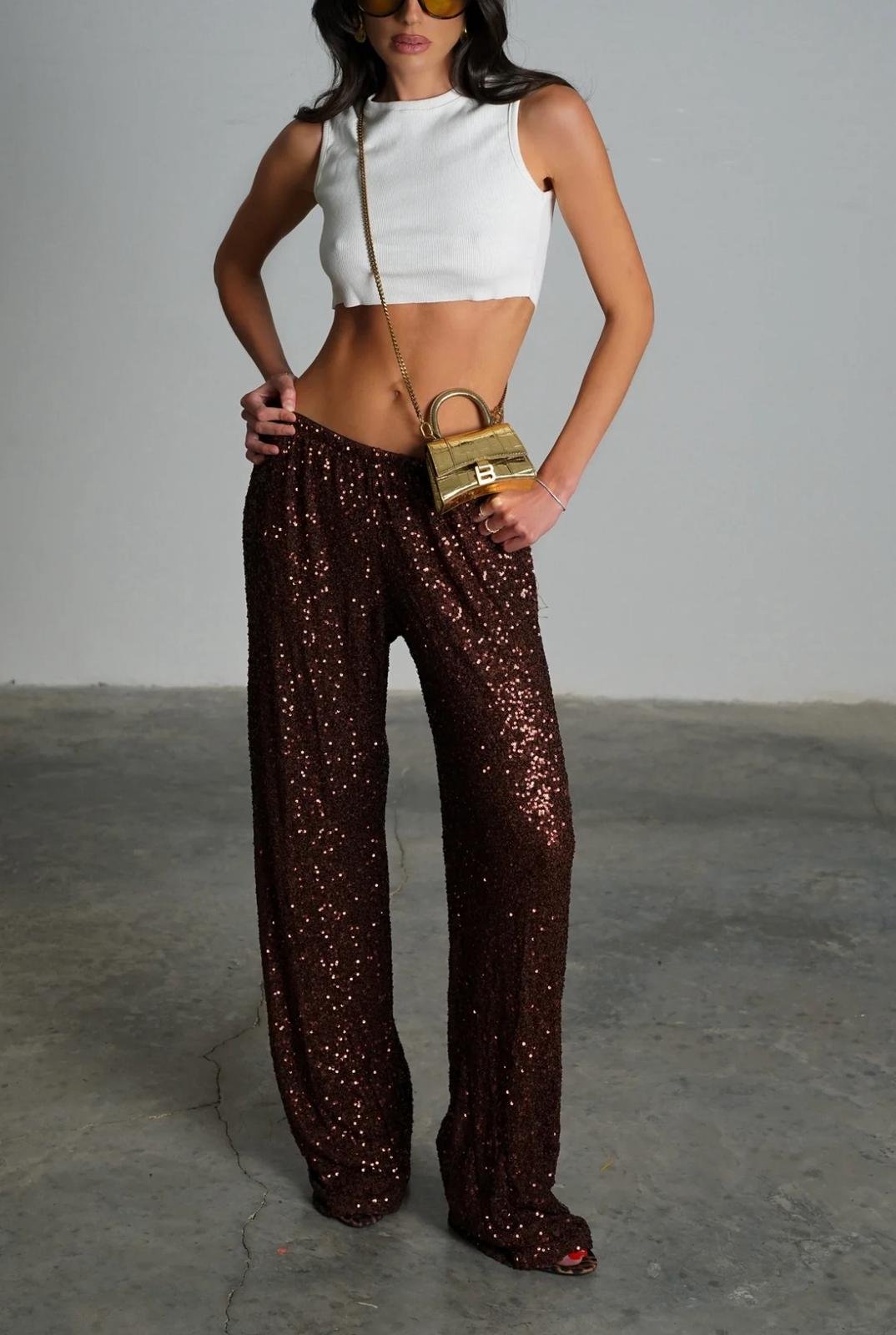 הפיס שיגרום לכולם לעצור ולסובב את הראש. מכנסי נורי הם מכנסי פאייטים נוטפי גלאם בגזרה רחבה ונשפכת. הצבע החום-ברונזה העמוק נותן טוויסט יוקרתי, חם ומתוחכם לטרנד הנצנצים, ויוצר הופעה מהפנטת. פשוט לצוות גופיית בייסיק קטנה או טופ חלק, וקיבלת את לוק הערב הכי נכון, זוהר ובלתי מתאמץ שיש.