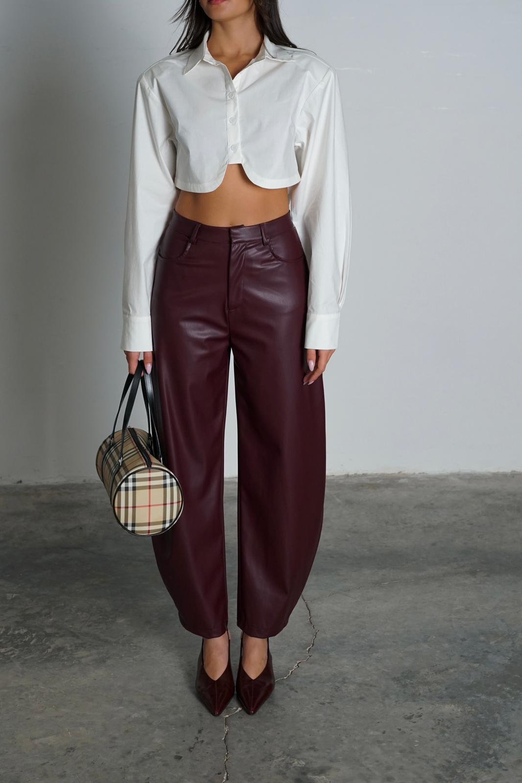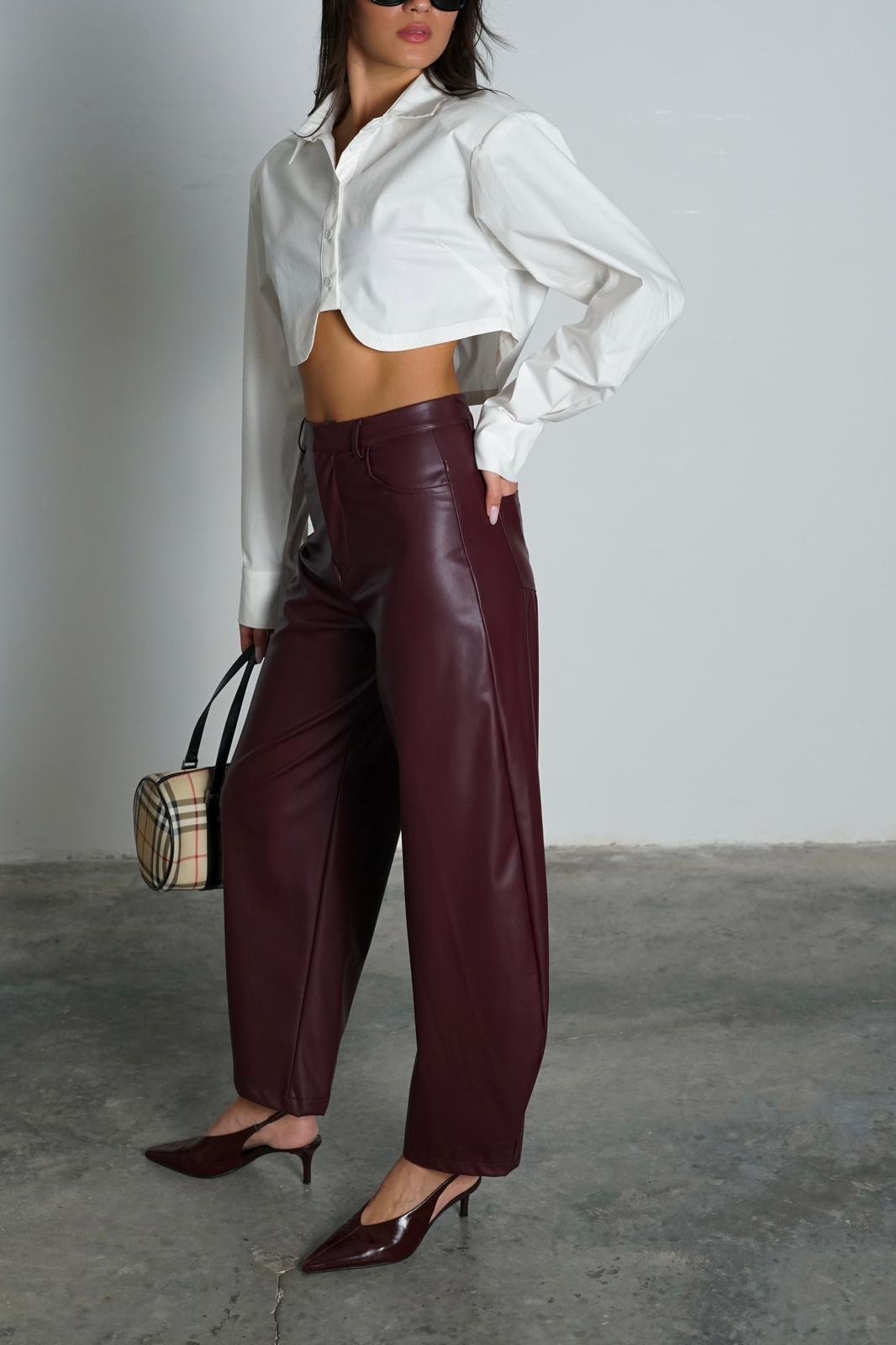 הפיס שיקפיץ לך את המלתחה העונה! מכנסי מרלו לוקחים את טרנד הבלון ההיסטרי צעד אחד קדימה, עם שילוב מטריף של בד דמוי עור איכותי בגוון בורדו יין עשיר. גזרה גבוהה ומחמיאה שאוספת את המותן, יחד עם רגליים רחבות שנסגרות למטה, יוצרות מראה מלא סטייל ונוכחות. בול ללוק ערב סקסי, יציאה למסעדה, או סטריט-סטייל סופר עדכני שאי אפשר להוריד ממנו את העיניים.