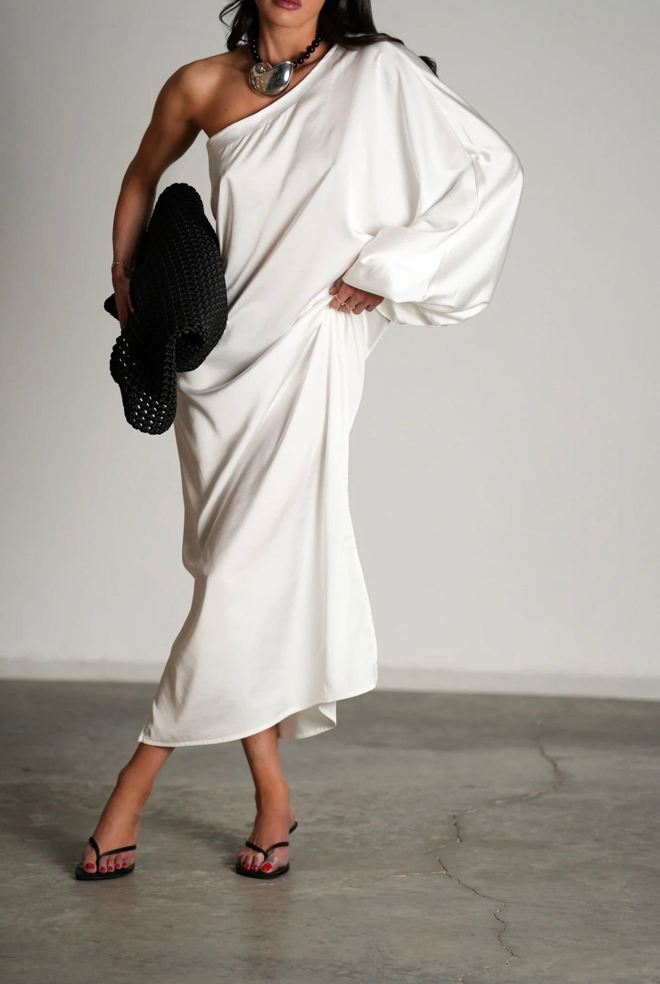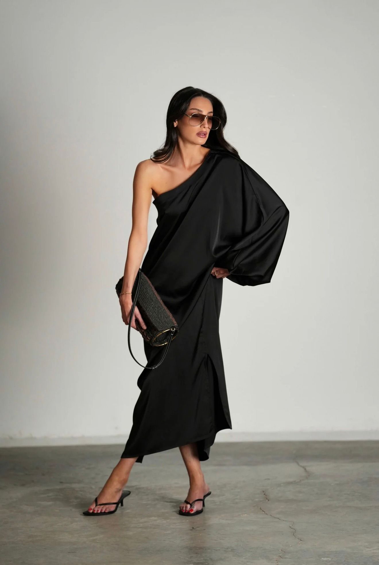 מחפשת שמלת ערב שתשלב נוחות מוחלטת עם מראה עוצר נשימה? הכירי את שמלת אתנה. מדובר בשמלת מקסי לנשים המעוצבת מגזרה משוחררת ונינוחה הנופלת ברכות על הגוף. השמלה מציגה עיצוב א-סימטרי הכולל כתף אחת חשופה המחמיאה לקו הצוואר והבריח, ומנגד שרוול אחד ארוך ורחב עתיר בבד ונפח המוסיף דרמה מדויקת ללוק. הבד האיכותי מתאפיין בברק עדין המעניק מראה יוקרתי, והחצאית באורך מקסי משלבת שסע צדדי המעניק חופש תנועה, קלילות ואוורור. אידיאלית כשמלת ערב לאירועים, חתונות צהריים, חופשת ריזורט אקסקלוסיבית או הופעה שבה את רוצה להרגיש זוהרת, נינוחה ומלאת ביטחון.