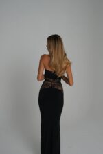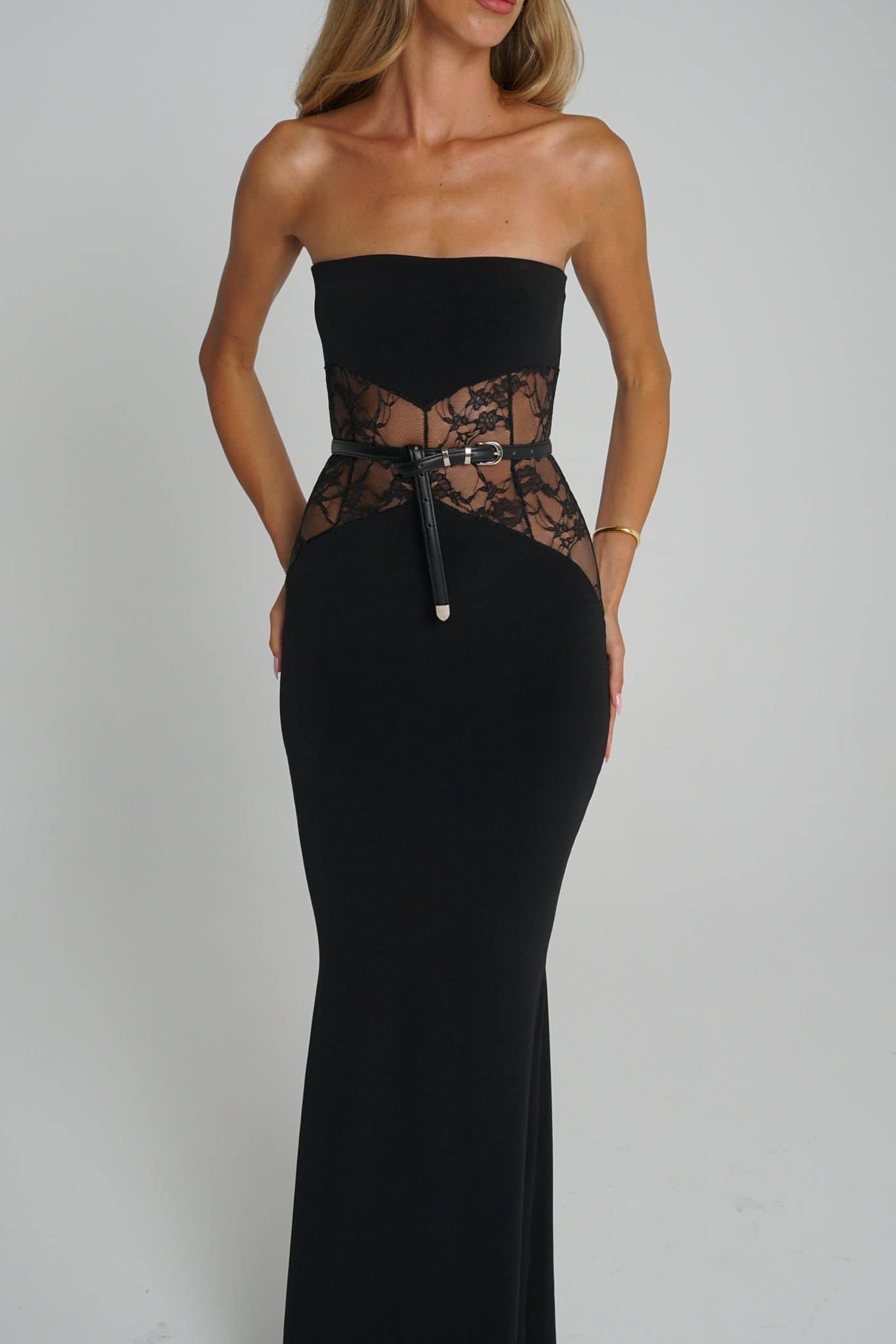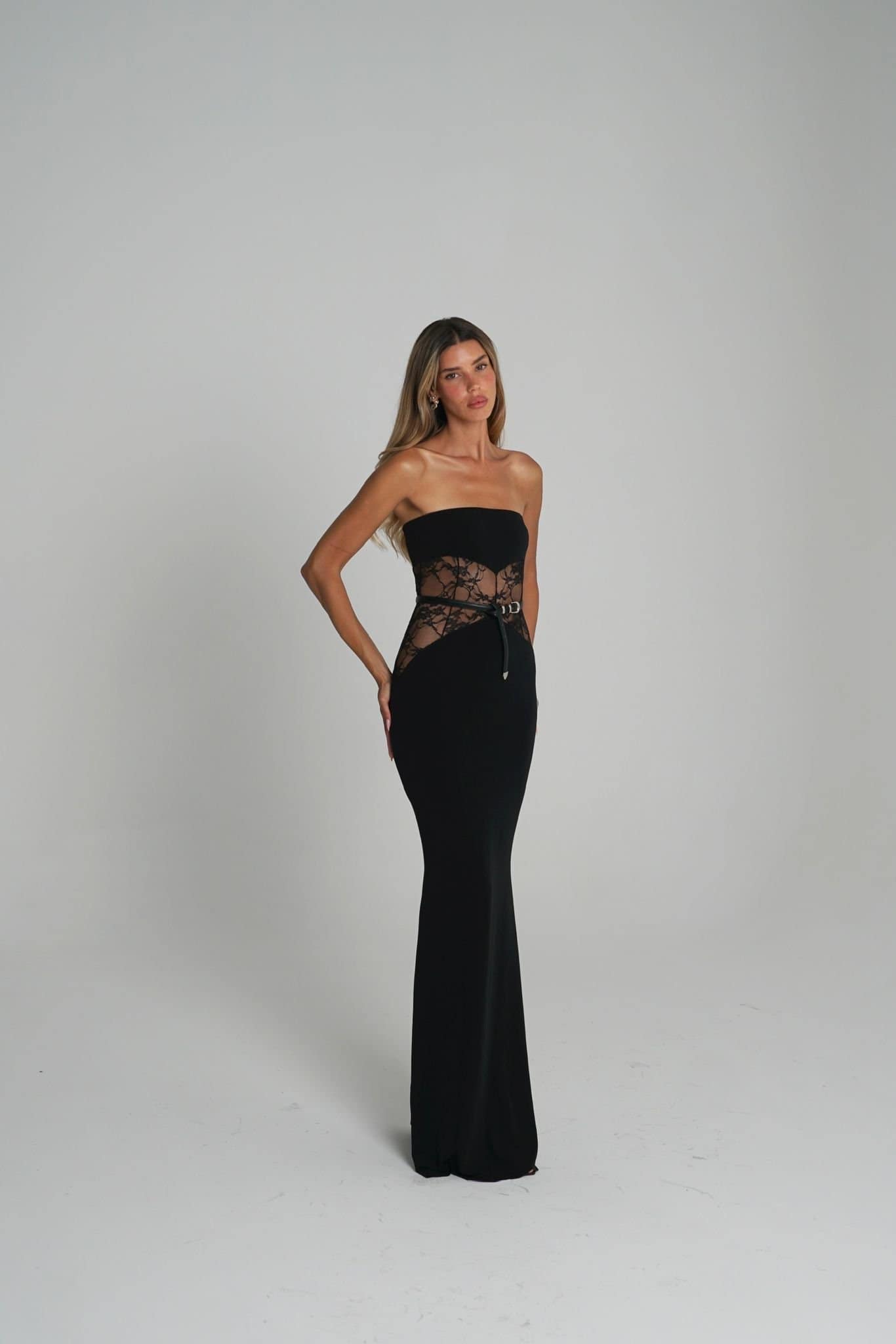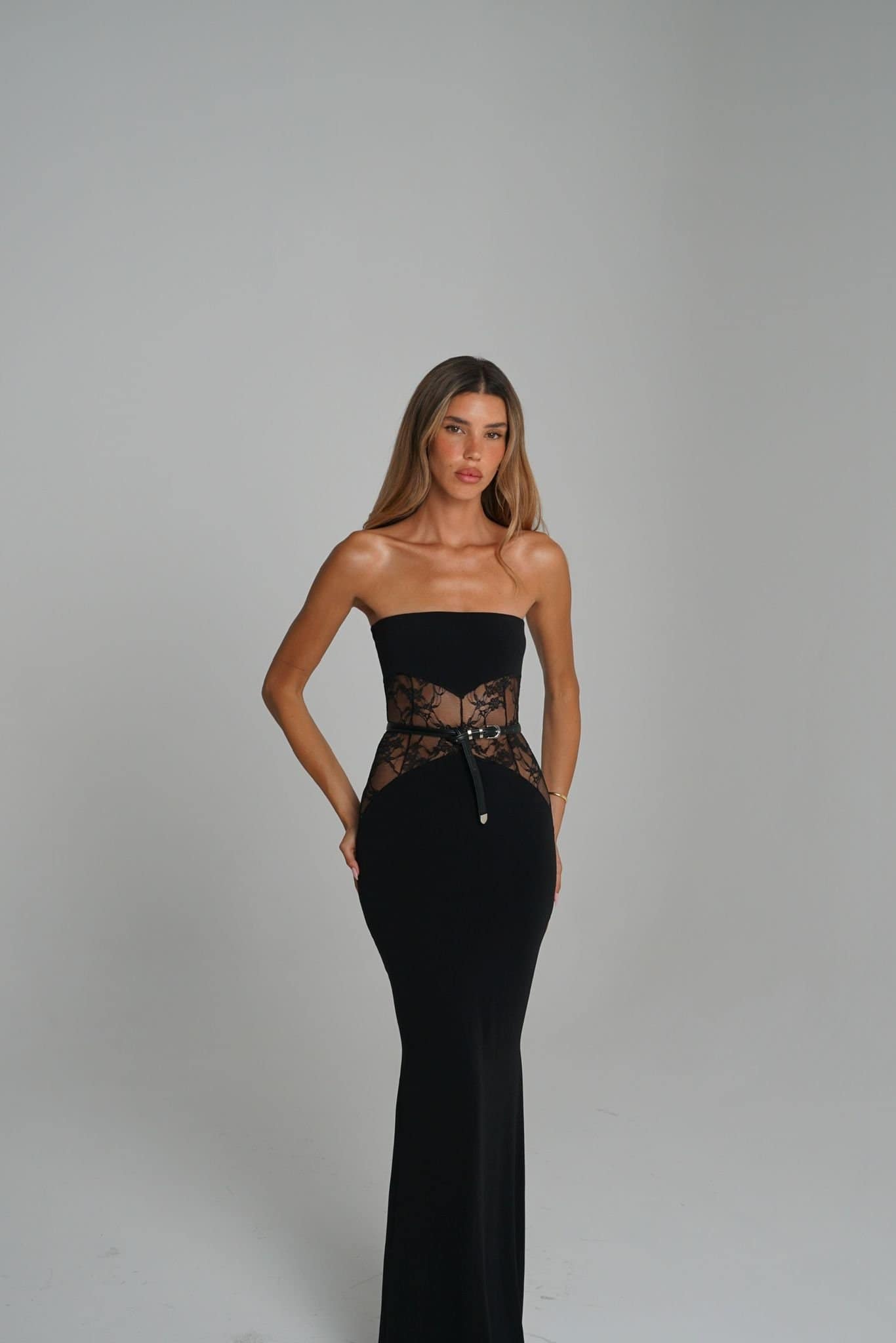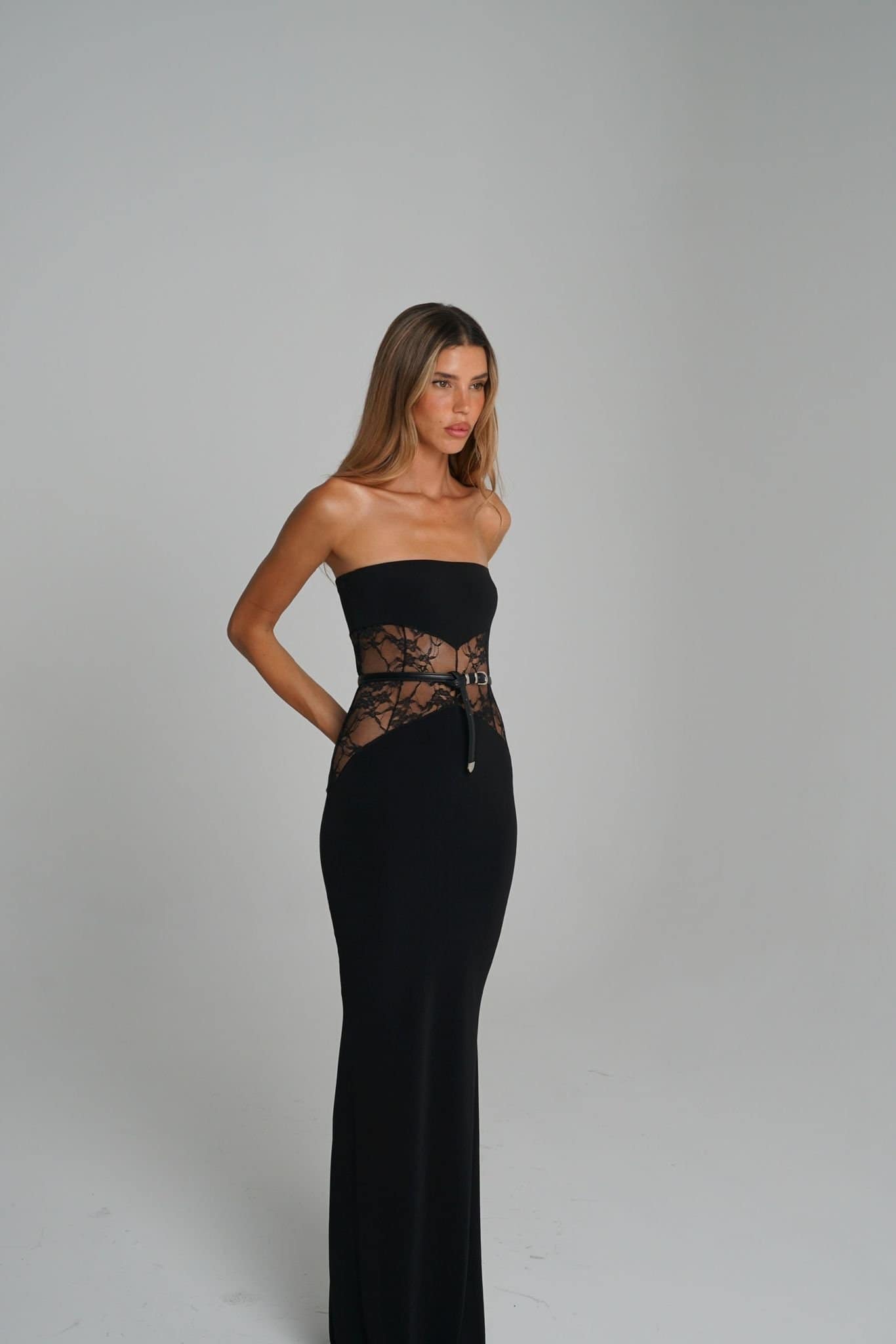 המקום שלך לזהור. ✨ שמלת סטרפלס מקסי שחורה והיסטרית המשלבת מחוך תחרה עדין ומחטב, חצאית נשפכת וחגורה עדינה במותן המדגישה את הגוף בשלמות. הפיס המושלם לאירוע ערב, מסיבה או לכל רגע שבא לך לדפוק הופעה בלתי נשכחת שתשאיר את כולם פעורי פה.