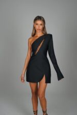 מחפשת את השמלה השחורה שתגנוב את ההצגה? הכירי את שמלת המיני האסימטרית מיה. מדובר בשמלה צמודה ומחטבת בצבע שחור עמוק, העשויה מבד אלסטי ואיכותי האוסף את הגוף. השמלה מעוצבת בגזרת כתף אחת נועזת, עם שרוול ארוך בצד שמאל הכולל כרית כתף קלה למבנה, מול כתף חשופה לחלוטין. גולת הכותרת היא מפתח החיתוך המפוסל באזור החזה, המעוטר בבד רשת שחור עדין ואוורירי המוסיף טאץ' מסתורי. השמלה כוללת שסע מיני עדין בצד ימין וכיווצים מחמיאים במותן. בחירה מושלמת כשמלה למסיבה, בגד ערב, או הופעה בלתי נשכחת לבילוי לילי בבוטיק האונליין. שילוב מנצח של נועזות, נשיות ואיכות פרימיום.