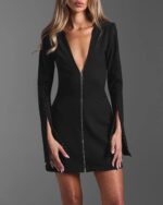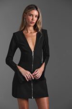 מחפשת שמלת מיני שחורה עם אופי ונוכחות? הכירי את שמלת שון. מדובר בשמלה צמודה ומחטבת בצבע שחור עמוק, המשלבת עיצוב מודרני עם נגיעות אדג'יות. השמלה מעוצבת עם כתפיים מובנות למראה מוקפד, מחשוף וי עמוק, ורוכסן ניקל מרכזי לכל אורכה המוסיף טאץ' חצוף ומאפשר משחק עם עומק המחשוף. השרוולים הארוכים מתאפיינים בפתחים ייחודיים לאורך הידיים, המעוטרים בקרסים מתכתיים המעניקים חספוס נועז ומלא סטייל. גזרת השמלה היא מידה אחת, המחמיאה ואוספת את הגוף. אידיאלית כשמלה למסיבה, לוק ליציאה, או הופעה אדג'ית ובלתי נשכחת בבוטיק אונליין.